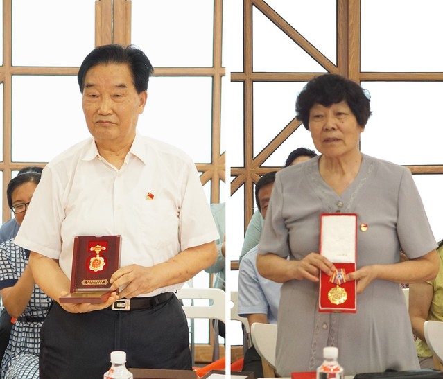會(huì)上,王俊、張啟芳老師夫婦還為大家展示了他們獲得的兩枚極其珍貴的紀(jì)念勛章。分別是2019年獲得的“慶祝中華人民共和國成立70周年”紀(jì)念章和1996年獲得的中國航天獎(jiǎng),這兩枚獎(jiǎng)?wù)率菍?duì)兩位老先生科研工作的最大褒獎(jiǎng)。捧著沉甸甸的獎(jiǎng)?wù)拢瑑晌焕辖處焺?dòng)情地表示“為國、為黨奮斗,祖國不會(huì)忘記,人民不會(huì)忘記你”。