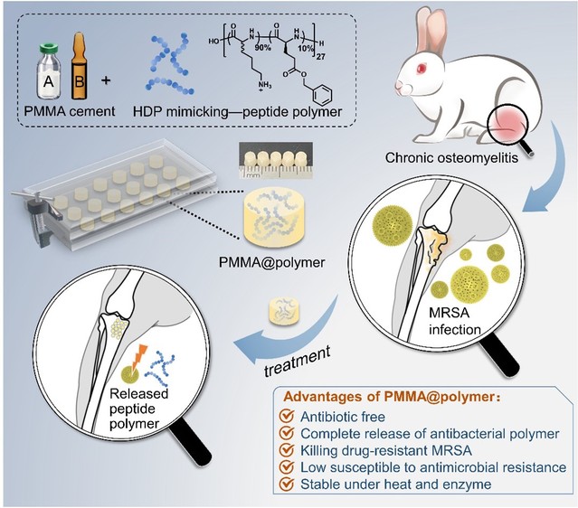 近日,我校材料科學與工程學院劉潤輝教授課題組和上海市第一人民醫(yī)院林浩東教授團隊合作,制備了基于宿主防御肽模擬的抗菌多肽聚合物摻雜的聚甲基丙烯酸甲酯PMMA骨水泥微球 (PMMA@polymer),在兔慢性骨髓炎模型中表現(xiàn)出優(yōu)異的體內(nèi)治療效果。該成果以“Peptide Polymer-Doped Cement Acting as an Effective Treatment of MRSA-infected Chronic Osteomyelitis”為題發(fā)表在《先進功能材料》(DOI: 10.1002/adfm.202107942)。