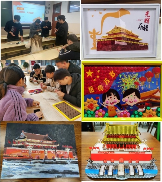 第2組、第3組和第8組選擇制作“天安門”衍紙畫、模型,“慶祝建黨百年”紐扣畫等,中華人民共和國中央人民政府成立典禮、“五四運(yùn)動(dòng)”、“一二·九運(yùn)動(dòng)”都在這里為中國現(xiàn)代革命史留下了濃重的色彩,通過制作紅色作品,深入學(xué)習(xí)中華民族走向偉大復(fù)興的發(fā)展歷程。