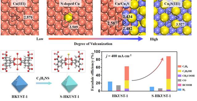 針對(duì)這一關(guān)鍵問題,研究團(tuán)隊(duì)創(chuàng)新性地采用局域硫摻雜策略在廉價(jià)Cu基催化材料中引入離散的Cu-S組分。研究發(fā)現(xiàn),該催化劑可以原位重構(gòu)得到具有豐富活性結(jié)構(gòu)的兩相銅/硫化銅界面,電流密度達(dá)到400 mA cm-2,乙烯法拉第效率高達(dá)57.2%,多碳產(chǎn)物(乙烯、乙醇和乙酸)法拉第效率為88.4%。通過Operando X射線同步吸收譜等表征證明,離散的Cu-S組分可以在CO2還原工況環(huán)境下穩(wěn)定高活性的Cuδ+組分;密度泛函理論計(jì)算進(jìn)一步揭示兩相銅/硫化銅界面處的Cuδ+組分C-C偶聯(lián)位點(diǎn)空間距離適中,可以協(xié)同降低C-C偶聯(lián)步驟的能壘。該工作實(shí)現(xiàn)了電催化二氧化碳還原制乙烯性能的大幅提升,對(duì)二氧化碳資源化利用實(shí)現(xiàn)閉環(huán)碳循環(huán),以及助力“碳達(dá)峰、碳中和”目標(biāo)的實(shí)現(xiàn)具有重要意義。
