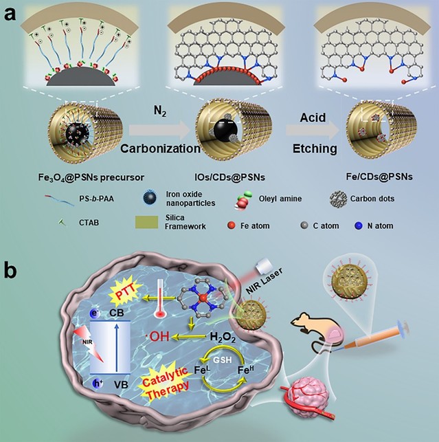 相較于大量關(guān)于碳基單原子體系在工業(yè)催化領(lǐng)域的研究,面向生物應(yīng)用的單原子材料的構(gòu)建仍處于起步階段。因此,發(fā)展高效的生物用單原子體系在生物醫(yī)藥領(lǐng)域具有重大的臨床應(yīng)用潛力。基于此,本工作提出了一種簡便通用的“界面限域配位”策略,在具有良好生物相容性的雙介孔二氧化硅孔道內(nèi)構(gòu)建金屬單原子納米治療劑用于腫瘤的高效安全治療。利用多孔氧化硅納米反應(yīng)器中的孔道限域效應(yīng),通過原位高溫碳化嵌段共聚物(聚苯乙烯-b-聚丙烯酸/PS-b-PAA)和含氮小分子(十六烷基三甲基溴化銨/CTAB和油胺)形成氮摻雜的碳點、再借助碳點與氧化鐵納米顆粒界面處的Fe-N-C配位作用及后續(xù)的酸刻蝕技術(shù),實現(xiàn)硅基Fe 單原子納米治療劑的可控精準構(gòu)筑。基于受限介孔孔道中獨特的Fe-N-C單原子結(jié)構(gòu),該硅基 Fe 單原子納米治療劑在外源性近紅外光輻照下具有高效的光熱轉(zhuǎn)換能力,其光熱轉(zhuǎn)換效率可達58.1%,是傳統(tǒng)碳基光熱試劑(不含單原子結(jié)構(gòu))的3倍之多。DFT計算進一步揭示了孔道限域環(huán)境下單原子結(jié)構(gòu)增強碳基材料光熱性能的內(nèi)在機制,主要源于孔道內(nèi)單原子錨定的缺陷碳結(jié)構(gòu)中電子密度增加、帶隙減小。此外,孔道中的Fe單原子結(jié)構(gòu)還具有pH/GSH雙觸發(fā)的腫瘤微環(huán)境響應(yīng)催化治療能力,即可將內(nèi)源性雙氧水轉(zhuǎn)化為羥基自由基來殺傷腫瘤細胞,并在細胞和活體層面分別論證了該硅基 Fe 單原子納米治療劑在高效腫瘤光熱/催化治療方面的應(yīng)用潛力。該工作將為設(shè)計和精準構(gòu)建具有可調(diào)變金屬成分的多功能單原子納米治療劑以實現(xiàn)安全有效的腫瘤治療提供了新的思路和科學指導。
