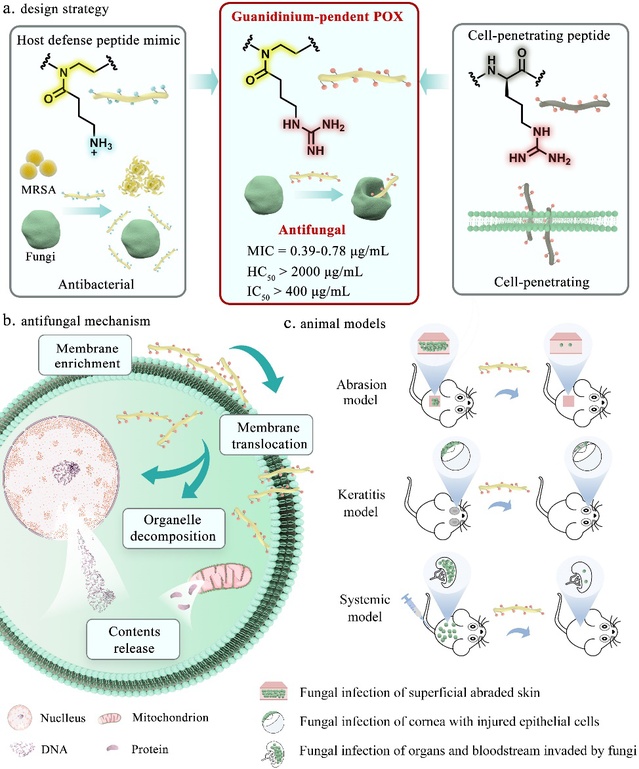 劉潤(rùn)輝教授研究團(tuán)隊(duì)在前期研究中首次發(fā)現(xiàn)聚(2-噁唑啉)可以作為新一類的功能性多肽模擬骨架結(jié)構(gòu),并以側(cè)鏈氨基功能化的聚(2-噁唑啉)模擬宿主防御肽獲得高效抗耐藥細(xì)菌聚合物(Angew. Chem. Int. Ed. 2020, 59, 6412-6419,VIP 論文, inside cover,高被引論文)。在前期工作的基礎(chǔ)上,近日劉潤(rùn)輝教授研究團(tuán)隊(duì)受細(xì)胞穿透肽啟發(fā),通過(guò)模擬宿主防御肽設(shè)計(jì)了一種短鏈長(zhǎng)的胍基功能化聚(2-噁唑啉),能夠有效穿透真菌細(xì)胞膜從而殺死真菌,實(shí)現(xiàn)了體外高效的選擇性抗真菌功能和體內(nèi)出色的抗耐藥真菌感染治療效果,為設(shè)計(jì)新型高效選擇性抗真菌化合物以對(duì)抗耐藥真菌感染提供了一種新策略。
