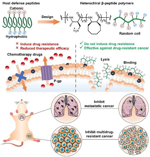 近日,我校材料學(xué)院劉潤輝教授課題組在治療耐藥腫瘤研究中取得了突破成果,以β多肽聚合物模擬宿主防御肽發(fā)現(xiàn)了高效抗耐藥腫瘤功能。該成果以“Heterochiral β-Peptide Polymers Combating Multidrug-Resistant Cancers Effectively without Inducing Drug Resistance”為題發(fā)表在《美國化學(xué)會(huì)志》(J. Am. Chem. Soc. 2022, DOI: 10.1021/jacs.2c00452)