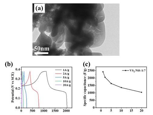 研究結(jié)果顯示當(dāng)復(fù)合比例為1:7時得到的復(fù)合材料,雖然僅相當(dāng)于在NiS中引入12.5%的VS2,但比電容卻比單純的NiS增加100%以上,不僅這種復(fù)合材料本身具有優(yōu)異的電化學(xué)性能,而且將其與活性炭組裝成非對稱超級電容器時,展現(xiàn)出了高的能量密度,在儲能器件領(lǐng)域具有重要的研究和應(yīng)用價值。