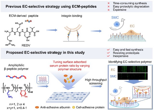 血管內(nèi)皮層作為血管的內(nèi)部屏障,在許多生理和病理過程中發(fā)揮著關(guān)鍵的作用。然而,人工血管和血管支架植入等造成的內(nèi)皮層損傷會(huì)導(dǎo)致平滑肌細(xì)胞的過度增殖、血小板活化等問題,最終引發(fā)內(nèi)膜增生及血栓形成。因此,選擇性促進(jìn)內(nèi)皮細(xì)胞生長(zhǎng)和促快速內(nèi)皮化是維持血管長(zhǎng)期通暢的最有效策略之一。目前,只有種類極為有限的細(xì)胞外基質(zhì)(ECM)多肽(REDV和YIGSR)常被用于促進(jìn)生物材料內(nèi)皮化的活性成分。然而,這些多肽容易被酶解、體內(nèi)穩(wěn)定性和功能持效性差、價(jià)格昂貴且難以大量制備,限制了其實(shí)際應(yīng)用。本研究設(shè)計(jì)和發(fā)現(xiàn)了一種新的聚合物策略,實(shí)現(xiàn)了對(duì)內(nèi)皮細(xì)胞顯著的選擇性和優(yōu)異的促快速內(nèi)皮化功能。此外,β-多肽聚合物通過一鍋法聚合制備,具有優(yōu)異的抗蛋白酶水解能力和穩(wěn)定性,相對(duì)于多肽具有價(jià)格低廉且易于大批量合成等優(yōu)點(diǎn),能夠針對(duì)性的有效克服ECM多肽的關(guān)鍵缺點(diǎn),對(duì)血管內(nèi)皮化的研究和相關(guān)應(yīng)用具有重要意義。