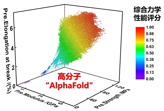 圖1. 面向高性能環(huán)氧樹脂設(shè)計的“AlphaFold”模型,可高效、快速計算不同分子結(jié)構(gòu)環(huán)氧樹脂的強度、模量和斷裂伸長,性能3D圖中包涵24萬個環(huán)氧結(jié)構(gòu)的強度、模量和斷裂伸長。顏色由紫到紅表示綜合力學(xué)性能的由弱到強。