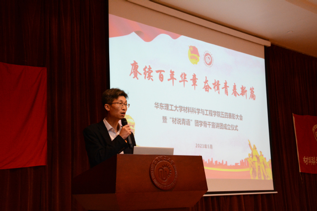 為扎實(shí)推進(jìn)主題教育,深入貫徹落實(shí)黨的二十大精神,進(jìn)一步弘揚(yáng)五四精神,加強(qiáng)基層團(tuán)組織建設(shè),5月9日,材料科學(xué)與工程學(xué)院在奉賢校區(qū)敬賢堂舉行五四表彰大會(huì)暨“材說(shuō)青語(yǔ)”宣講團(tuán)成立儀式。材料學(xué)院黨委副書記戴誠(chéng)安、校團(tuán)委掛職干部黃澤煬、材料學(xué)院團(tuán)委書記張雪薇、副書記周翀,以及團(tuán)員青年代表共150余人出席本次活動(dòng)。