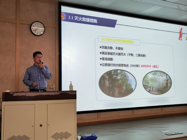 段凱洋圍繞“牢固樹立學(xué)校安全發(fā)展理念,精準(zhǔn)有效防控重大消防風(fēng)險”這一主題,結(jié)合消防安全公益宣傳,從消防責(zé)任、火災(zāi)防范、滅火救援、疏散逃生四個方面進(jìn)行分享。針對火災(zāi)防范,以電動車充電導(dǎo)致的消防隱患為例,講解了消防安全管理規(guī)定,告誡同學(xué)們不使用違章電器、不私拉亂接電線、不私自動用明火等,并介紹了滅火毯和滅火器等消防工具的使用方法。針對滅火救援,以實(shí)驗(yàn)室火災(zāi)中的不當(dāng)處理為例,呼吁同學(xué)們冷靜沉著,多實(shí)操、多訓(xùn)練,關(guān)鍵時刻不慌忙抓瞎,靈活使用各類消防工具。