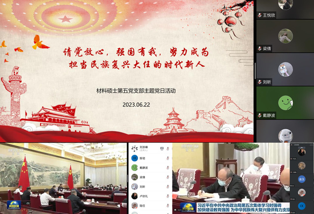 為深入學(xué)習(xí)貫徹習(xí)近平總書記在中央政治局第五次集體學(xué)習(xí)時(shí)的重要講話精神,6月22日,材料碩士第五黨支部開展了“堅(jiān)定不移聽黨話、跟黨走,努力成長為堪當(dāng)民族復(fù)興重任的時(shí)代新人”主題黨日活動(dòng),活動(dòng)由黨支部書記劉浙峰主持。