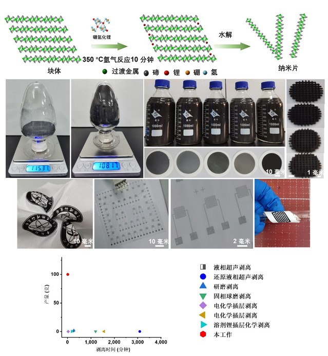 二維過渡金屬碲化物材料一般采用“自上而下”的制備方法,如同拆解積木,通過機械力或化學作用方式將其一層一層剝離下來,從而制備出單層的二維納米片。常用的“自上而下”方法有化學插層剝離法、球磨法、膠帶剝離法、液相超聲法等,其中,化學插層剝離法剝離效率雖然最高,但剝離仍需要數小時。此前,科學家們大多采用有機鋰試劑作為插層劑,即將含有鋰離子的插層劑插入塊體層狀結構材料的片層中,并利用鋰和水的反應使插層劑“膨脹”,在每一層間形成一個“氣壓柱”,將疊在一起的納米片層層“撐開”,就如同使用了一把“化學刮刀”一層一層地將納米片“刮”下來,這種層間的氣體膨脹作用力遠大于機械剝離力,可以極大地提高剝離效率。但有機鋰是一種易燃易爆的液體試劑,具有很大的安全隱患,因此,實現安全、高效的化學剝離成為科學家努力的目標。