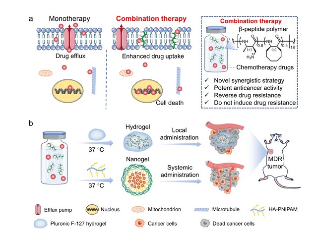 腫瘤對(duì)化療藥物產(chǎn)生的多藥耐藥性和交叉耐藥性仍然是癌癥治愈的主要障礙。目前,單一療法只能暫時(shí)緩解腫瘤的進(jìn)展,無(wú)法避免抗癌藥物耐藥性的出現(xiàn)。為了解決腫瘤耐藥性難題,一種有效策略是將現(xiàn)有的兩種或多種化療藥物聯(lián)合使用,以減少藥物用量并獲得更好的治療效果。然而,由于單個(gè)化療藥物固有的耐藥性以及腫瘤細(xì)胞對(duì)多種藥物組合的交叉耐藥性,現(xiàn)有的藥物組合也出現(xiàn)了耐藥性問題。因此,迫切需要尋求新型治療藥物和現(xiàn)有化療藥物的協(xié)同組合能逆轉(zhuǎn)化療藥物的耐藥性并減輕耐藥性的產(chǎn)生。劉潤(rùn)輝教授課題組在前期研究中通過設(shè)計(jì)宿主防御肽的合成模擬物,開發(fā)出了一類抗多藥耐藥腫瘤的β-多肽聚合物(J. Am. Chem. Soc. 2022, 144(16): 7283-7294)。這些β-多肽聚合物對(duì)多藥耐藥癌細(xì)胞具有高效且廣譜的抗癌活性,并且通過膜裂解機(jī)制殺死癌細(xì)胞,因此重復(fù)使用不會(huì)導(dǎo)致癌細(xì)胞產(chǎn)生耐藥性。這啟發(fā)作者提出設(shè)想:β-多肽聚合物可以通過增加細(xì)胞膜的通透性來(lái)促進(jìn)化療藥物的跨膜轉(zhuǎn)運(yùn),從而增加藥物攝取和細(xì)胞內(nèi)藥物積累。因此,作者進(jìn)一步探索抗腫瘤β-多肽聚合物和多種化療藥物的協(xié)同作用。研究發(fā)現(xiàn)抗腫瘤β-多肽聚合物和多種化療藥物具有廣譜且高效的協(xié)同作用,逆轉(zhuǎn)多藥耐藥癌細(xì)胞對(duì)多種化療藥物的耐藥性。β-多肽聚合物和阿霉素的協(xié)同組合在小鼠多藥耐藥黑色素瘤和耐藥原位乳腺癌模型中都顯著改善了阿霉素的治療效果。值得注意的是,癌細(xì)胞不會(huì)對(duì)β-多肽聚合物和阿霉素的協(xié)同組合產(chǎn)生耐藥性。因此,β-多肽聚合物和化療藥物的協(xié)同策略為耐藥腫瘤治療和逆轉(zhuǎn)腫瘤耐藥性提供了新思路。