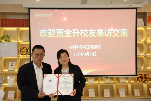 會上,袁媛為賈金升校友頒發(fā)無機非金屬材料工程專業(yè)實習(xí)指導(dǎo)教師聘書。