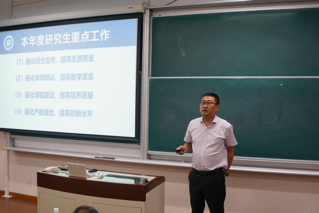 副院長胡彥杰從強化招生宣傳、提升生源質(zhì)量,強化導(dǎo)師培訓(xùn)、提高教學(xué)質(zhì)量,強化課程建設(shè)、提高培養(yǎng)質(zhì)量,強化產(chǎn)教融合、提高創(chuàng)新水平等方面匯報了研究生相關(guān)工作。