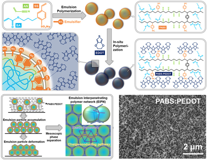 在這項工作中,通過分步乳液聚合,合成了一種由含磺酸鹽的硬彈性共聚物核和聚(3,4-乙烯二氧噻吩)導電聚合物殼組成的水性導電粘結劑(PABS:PEDOT)。當該粘結劑干燥并觸發(fā)乳膠顆粒融合時,基于內核組分和外殼組分間的靜電作用以及各自鏈段的聚集特性,通過調控二次摻雜劑二甲基亞砜的引入,兩者會發(fā)生介觀相分離形成互穿網絡。依靠源自內核的富含極性基團彈性骨架和源自外殼具有氧化還原介質功能的電荷傳輸通道的協(xié)同作用,賦予硫正極優(yōu)異的倍率性能(4 C,817 mAh g-1)與循環(huán)穩(wěn)定性(0.5 C,循環(huán)450次,容量保持率為81.6%)。由于各相的組成可以很容易地單獨調整,該研究可以為電極粘結劑提供一種新的設計方法,以應對許多領域的多種性能要求。