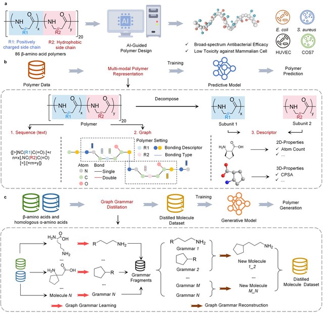 全球抗生素耐藥性風(fēng)險(xiǎn)不斷升級(jí),亟需探索高效抗耐藥菌廣譜抗菌劑的新策略。宿主防御肽因具有抗耐藥菌活性和不易使微生物產(chǎn)生耐藥性等優(yōu)勢(shì)被寄予厚望,其易結(jié)構(gòu)不穩(wěn)定、易酶解、難以大規(guī)模制備等缺點(diǎn)限制其實(shí)際應(yīng)用,傳統(tǒng)半經(jīng)驗(yàn)化的設(shè)計(jì)方法仍難以滿足抗耐藥菌化合物的迫切需求。盡管人工智能輔助藥物發(fā)現(xiàn)研究已經(jīng)取得進(jìn)展,但多肽模擬聚合物的無(wú)規(guī)序列導(dǎo)致難以全面表征聚合物結(jié)構(gòu),且小樣本數(shù)據(jù)限制了對(duì)聚合物性能的精準(zhǔn)預(yù)測(cè)與對(duì)超高維聚合物空間的高效探索。因此,基于小樣本聚合物實(shí)現(xiàn)人工智能設(shè)計(jì)具有理想目標(biāo)活性的優(yōu)選聚合物一直未取得突破。