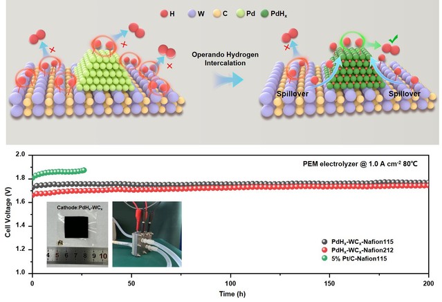 針對上述問題,我校研究團隊創(chuàng)新性地開發(fā)了一種工況穩(wěn)定、低貴金屬載量負載在WCx上的PdHx納米團簇析氫電催化劑材料(PdHx-WCx)。這種新型催化材料體系,利用了貴金屬Pd在電化學(xué)還原電位下原位注氫形成PdHx的特點,有效調(diào)節(jié)了Pd反應(yīng)位點的氫吸附能,誘導(dǎo)了反向氫溢流過程,即吸附氫原子從WCx載體(強氫結(jié)合能)溢流到PdHx位點(弱氫結(jié)合能)進行反應(yīng),進而加速了析氫反應(yīng)動力學(xué)。所形成的PdHx-WCx材料在制氫工況環(huán)境下結(jié)構(gòu)穩(wěn)定,在三電極測試體系中達到10 mA cm-2電流密度時僅需28 mV的低過電位,在50 mV的過電位下具有11.375 A mgPd-1的高質(zhì)量活性,相比與商用的Pt/C(20wt%)提高了7.9倍。進一步將該電催化劑材料應(yīng)用于PEMWE電解槽的陰極,Pd貴金屬負載量僅為0.022 mg cm-2,器件達到1 A cm-2電流密度時的電壓為1.66 V,并且連續(xù)運行200 h無明顯的性能衰減。與目前商業(yè)化PEMWE電解槽陰極水平相比(0.4 ~ 1.0 mgPt cm-2),本工作構(gòu)建的器件貴金屬負載量可降低至少94.5%,且不會明顯影響制氫器件的性能和穩(wěn)定性。