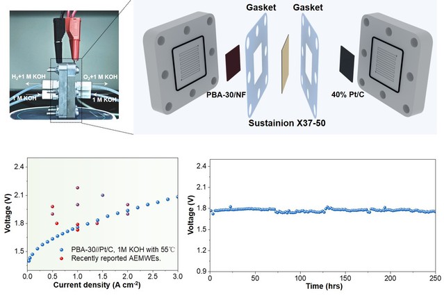 利用可再生能源驅(qū)動電解水制氫被認(rèn)為是實(shí)現(xiàn)“碳中和”目標(biāo)的重要手段之一。在眾多電解水技術(shù)中,陰離子交換膜電解水(AEMWE)制氫技術(shù)在氫氣純度、電解效率、制氫速率、冷啟動時間等方面具有優(yōu)勢,同時可以擺脫催化電極及槽體對貴金屬的依賴。目前,3d過渡金屬基電催化劑在堿性電解質(zhì)中表現(xiàn)出優(yōu)異的催化性能。然而,在工業(yè)級電流密度條件下,這類催化劑的長期穩(wěn)定性仍然是領(lǐng)域內(nèi)的重要挑戰(zhàn)。