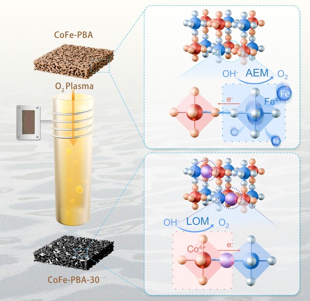 針對上述問題,我校研究團(tuán)隊(duì)創(chuàng)新性地采用高功率氧等離子體處理技術(shù),精確調(diào)控了CoFe雙金屬普魯士藍(lán)類似物(PBA)析氧催化劑的局域原子近程結(jié)構(gòu):在保留PBA晶體結(jié)構(gòu)框架的同時,通過破壞局域氰基配體并引入氧原子,成功構(gòu)建了Co-O-Fe的結(jié)構(gòu)基元,進(jìn)而將析氧反應(yīng)路徑從傳統(tǒng)的吸附物演化反應(yīng)機(jī)制(AEM)調(diào)節(jié)為動力學(xué)更優(yōu)的晶格氧氧化反應(yīng)機(jī)制(LOM)。