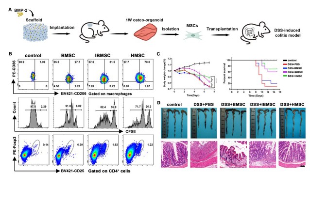 為解決這一問題,研究團(tuán)隊(duì)提出了一種新型的“自體MSC原位授權(quán)”策略,通過植入負(fù)載骨形態(tài)發(fā)生蛋白2(BMP-2)的生物活性材料在體內(nèi)構(gòu)建類骨組織,借助發(fā)育早期的炎性微環(huán)境來激活MSCs的免疫調(diào)節(jié)功能。研究表明,該方法所獲得的自體MSCs具有更低的免疫原性,有助于其在宿主中的長期存活,且更長時(shí)間保持其免疫調(diào)節(jié)能力。這些優(yōu)異的免疫調(diào)節(jié)特性使其在小鼠潰瘍性結(jié)腸炎的治療中獲得顯著的效果,降低死亡率,重塑結(jié)腸部位炎癥生態(tài)位。這種由植入活性材料而產(chǎn)生的自體來源MSC為干細(xì)胞治療提供了一種有前景的全新細(xì)胞來源。