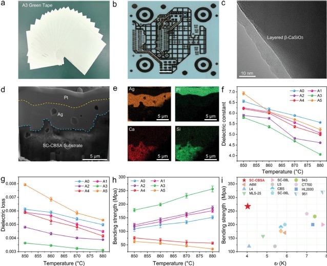 針對上述問題,研究團(tuán)隊突破傳統(tǒng)技術(shù)瓶頸,將Al3+摻雜到鈣硼硅酸鹽(CBS)玻璃體系中來調(diào)節(jié)玻璃的短程有序(SRO)和中程有序(MRO)結(jié)構(gòu),促進(jìn)了非均質(zhì)網(wǎng)絡(luò)結(jié)構(gòu)的形成,使得在能量上有利于納米級β-CaSiO3和亞納米級α-CaSiO3多晶顆粒的析出。隨著燒結(jié)溫度的升高,α-CaSiO3中的[Si3O9]-環(huán)被逐漸打開,轉(zhuǎn)變?yōu)橐?/span>[SiO3]∞鏈為特征結(jié)構(gòu)的β-CaSiO3晶體,相應(yīng)的Si-O-Si鍵角從134.76°轉(zhuǎn)變?yōu)?/span>143.31°,加快了納米級α-CaSiO3(2-10 nm)被β-CaSiO3吸收的過程。最終,轉(zhuǎn)變?yōu)橛行驅(qū)訝罱Y(jié)構(gòu)的單晶體β-CaSiO3(1-2 μm),并且其在整個微晶玻璃中的占比可高達(dá)85%。該高單晶含量的微晶玻璃兼具低介電常數(shù)(4.04@15 GHz)和高抗彎強(qiáng)度(256 MPa),并首次將單晶結(jié)構(gòu)應(yīng)用于封裝基板,并與銀漿共燒匹配良好。這種新型基板的性能不僅達(dá)到國際先進(jìn)水平,甚至在某些關(guān)鍵指標(biāo)上表現(xiàn)更為出色。