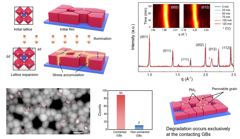 圖1. 鈣鈦礦薄膜中的光致伸縮現(xiàn)象及其加速退化效應(yīng)