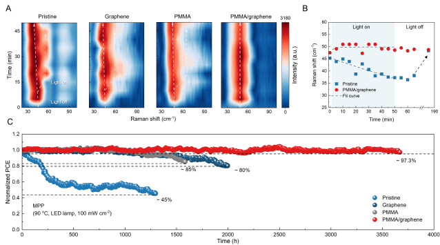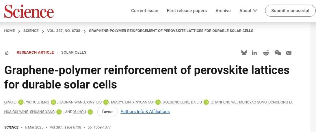 北京時(shí)間3月7日凌晨,華東理工大學(xué)材料學(xué)院清潔能源材料與器件團(tuán)隊(duì)侯宇教授、楊雙教授等人在Science(《科學(xué)》)發(fā)表題為“Graphene-polymer reinforcement of perovskite lattices for durable solar cells”的最新研究成果。該研究發(fā)現(xiàn)了鈣鈦礦光伏不穩(wěn)定性的關(guān)鍵機(jī)制——光機(jī)械誘導(dǎo)分解效應(yīng),提出石墨烯-聚合物機(jī)械增強(qiáng)鈣鈦礦材料的新方法,制備的太陽(yáng)能電池器件在標(biāo)準(zhǔn)太陽(yáng)光照及高溫下的T97工作壽命創(chuàng)下3670小時(shí)新紀(jì)錄,該研究成果將為鈣鈦礦太陽(yáng)電池的產(chǎn)業(yè)化應(yīng)用提供全新解決方案。