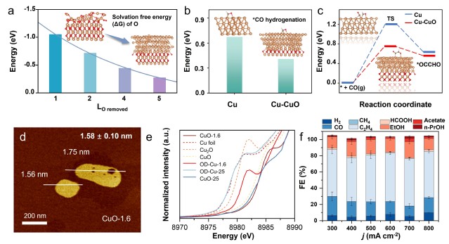 針對(duì)這一關(guān)鍵問題,我校材料科學(xué)與工程學(xué)院清潔能源材料與器件團(tuán)隊(duì)以CuO納米片為模型材料,探究了厚度對(duì)OD-Cu殘余氧的影響。當(dāng)CuO納米片厚度降至1.6 nm時(shí),氧保留能力顯著增強(qiáng),在300-700 mA cm-2的寬電流密度范圍內(nèi)實(shí)現(xiàn)了約80%的C2+產(chǎn)物法拉第效率(FE),并在700 mA cm-2條件下達(dá)到84.6%的C2+產(chǎn)物選擇性峰值。研究團(tuán)隊(duì)通過對(duì)CuO納米片材料進(jìn)行系統(tǒng)的結(jié)構(gòu)研究,闡明了納米片厚度對(duì)調(diào)控OD-Cu殘留氧的關(guān)鍵作用:分子動(dòng)力學(xué)模擬表明,隨著氧脫除層數(shù)增加,工況還原過程中Cu-CuO結(jié)構(gòu)的底層氧原子難以向外部擴(kuò)散,這種特性有效促進(jìn)了*CHO中間體形成以及后續(xù)的*OC-CHO偶聯(lián)反應(yīng),進(jìn)而提升了C2+產(chǎn)物選擇性;結(jié)合結(jié)構(gòu)表征、電化學(xué)分析以及相關(guān)原位表征結(jié)果,發(fā)現(xiàn)重構(gòu)堆疊的Cu-CuO納米片結(jié)構(gòu)具有強(qiáng)氧保留能力和易再氧化的金屬銅位點(diǎn),這種協(xié)同效應(yīng)優(yōu)化了OH-吸附和*CO富集,顯著促進(jìn)了C2+產(chǎn)物生成。該研究工作不僅為設(shè)計(jì)高效OD-Cu催化劑以實(shí)現(xiàn)CO2電還原制取多碳產(chǎn)物提供了重要理論依據(jù),同時(shí)揭示了氧保留效應(yīng)在CO2電還原反應(yīng)過程對(duì)催化性能的影響機(jī)制。
