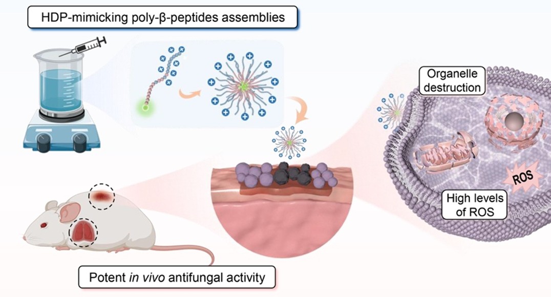 近日,我校材料科學(xué)與工程學(xué)院劉潤(rùn)輝教授課題組報(bào)道了一種對(duì)耐藥真菌具有體內(nèi)外高效抗菌活性的聚-β-多肽組裝體。該研究成果以“Self-assembled poly(sarcosine) functionalized host defense peptide-mimicking poly-β-peptides for combating drug-resistant fungal infection”(用于抗耐藥性真菌感染的自組裝聚肌氨酸功能化宿主防御肽模擬聚-β-多肽)為題發(fā)表在國(guó)際權(quán)威學(xué)術(shù)期刊《先進(jìn)功能材料》(Adv. Funct. Mater.2025, DOI:10.1002/adfm.202424125)上。