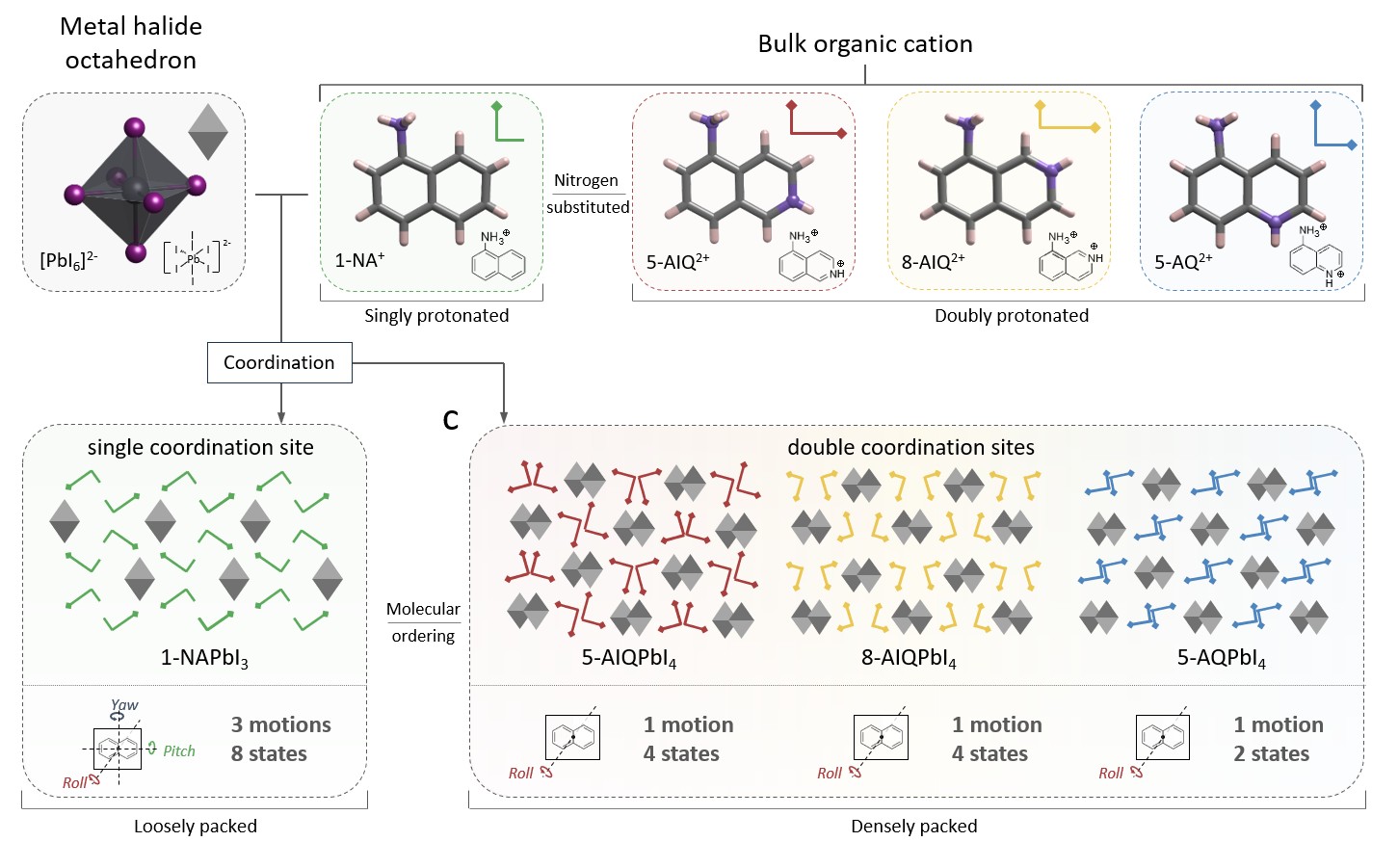 研究團隊將分子有序度的概念應用于鈣鈦礦材料(圖1),通過對萘基及喹啉基分子配位位點的精確調控,設計合成了一系列分子有序度可控的新型一維鈣鈦礦半導體材料,即1-萘胺鉛碘(1-NAPI3)、5-氨基異喹啉鉛碘(5-AIQPI4),8-氨基異喹啉鉛碘(8-AIQPI4)和5-氨基喹啉鉛碘(5-AQPI4)。其中,1-NAPI3擁有3個旋轉運動和8個旋轉狀態(tài)的最低有序度,而5-AQPI4僅具有1個旋轉運動和2個旋轉狀態(tài)的最高有序度。