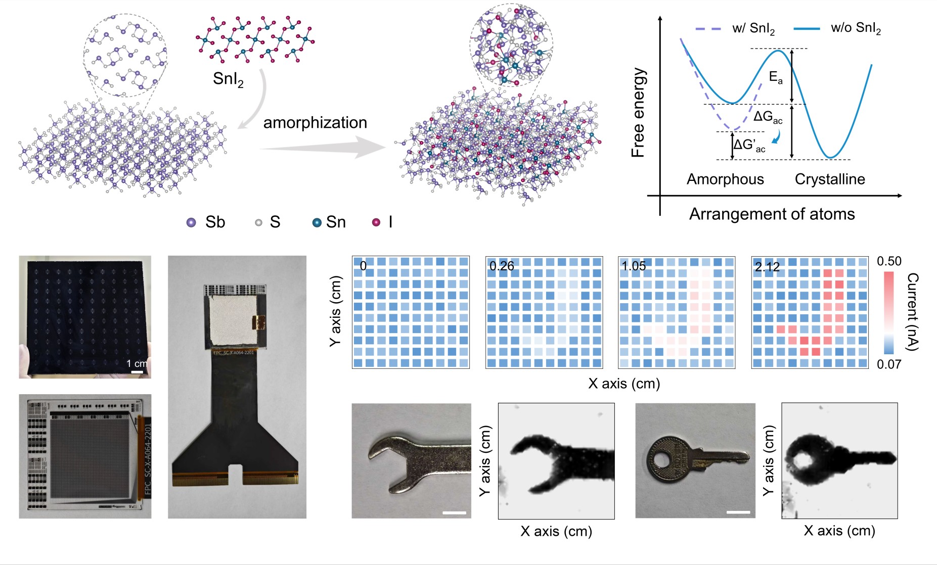 針對(duì)上述關(guān)鍵問題,研究團(tuán)隊(duì)通過異價(jià)摻雜方法,成功制備出具有高的相穩(wěn)定性、強(qiáng)電荷收集能力和器件可拓展性的非晶硫化銻材料。理論和實(shí)驗(yàn)研究發(fā)現(xiàn),異價(jià)金屬鹵化物的加入可改善Sb2S3鏈狀結(jié)構(gòu)并降低體系自由能,進(jìn)而增強(qiáng)了其玻璃化能力。非晶Sb2S3具有窄帶隙(1.66 eV)和高載流子壽命乘積(5.6×10-5 cm2 V-1)的優(yōu)勢(shì),由其組裝的X射線探測(cè)器在20 V mm-1電場下實(shí)現(xiàn)了4397 μC Gy-1 cm-2的探測(cè)靈敏度以及66 nGy s-1的最低檢測(cè)限。另外,基于非晶Sb2S3薄膜的面積均勻性和高靈敏度特性,成功實(shí)現(xiàn)了在低劑量率(2.12 μGy s-1)下實(shí)時(shí)高分辨的X射線成像。