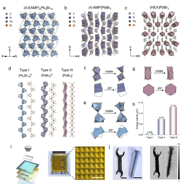 針對上述問題,研究團隊設計合成了一系列具有不同無機鏈構型(角共享、邊共享、面共享)的一維金屬鹵化物單晶材料,并系統(tǒng)討論了不同構型對材料熱學、力學性質的影響。值得注意的是,具有角共享無機鏈的4-乙氨甲基吡啶鉛溴(4-EAMP)2Pb3Br10表現(xiàn)出類聚合物的柔性特征,這一性質為其熔融過程提供了構象自由度,使其能在70 K的寬溫區(qū)間內穩(wěn)定熔融,并通過快速淬冷工藝實現(xiàn)大面積(直徑~6.5 cm)非晶玻璃的制備。非晶化的玻璃網(wǎng)絡結構阻礙了分子內離子的遷移路徑,顯著提高了材料的運行穩(wěn)定性;同時,優(yōu)異的熔融加工性使得該材料能輕易實現(xiàn)與薄膜晶體管(TFT)陣列的集成。最終,基于非晶(4-EAMP)2Pb3Br10玻璃的X射線探測器實現(xiàn)了高達8581.7μC Gyair-1 cm-2的靈敏度和在低劑量率下的多像素快速成像。上述工作為探索新型X射線探測材料、理解有機-無機雜化固體中熔融和玻璃化的起源及其結構表現(xiàn)提供了新的思路。