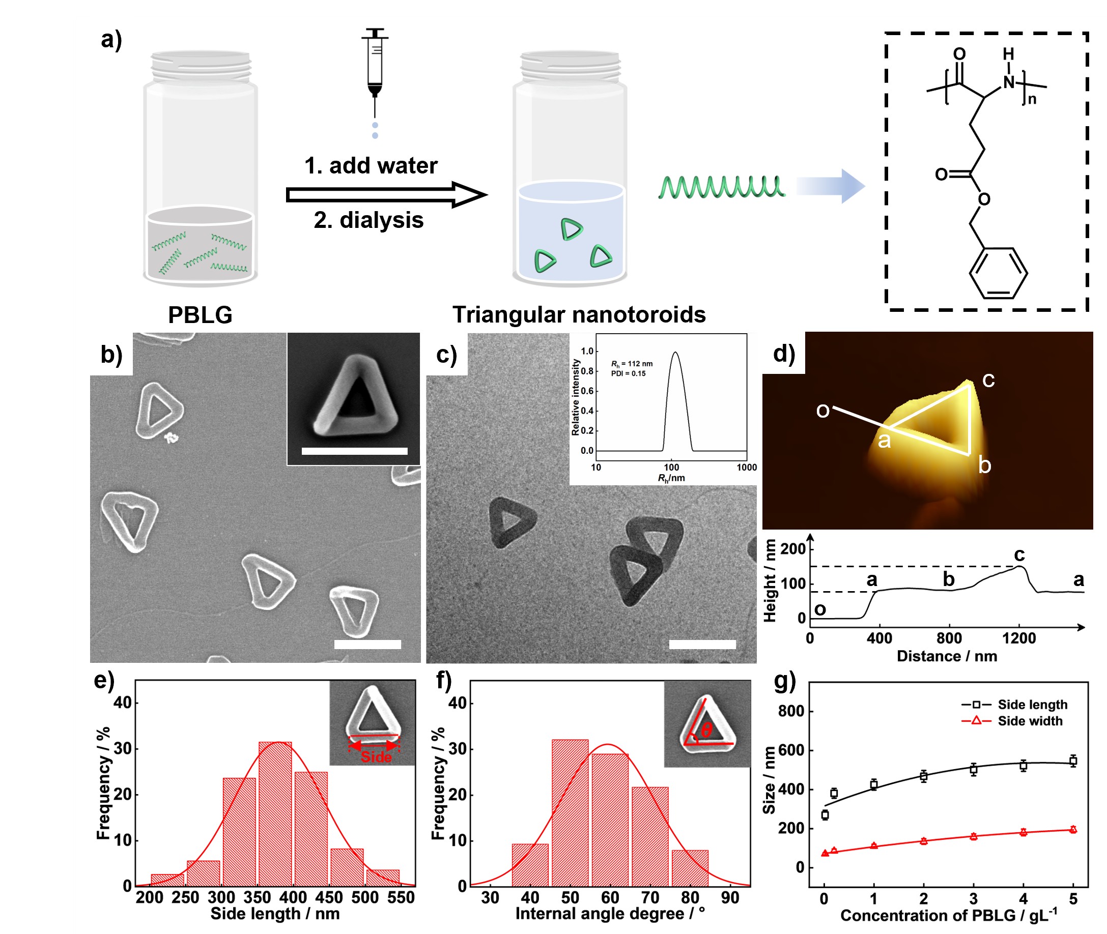 針對(duì)這一挑戰(zhàn),研究團(tuán)隊(duì)通過聚肽均聚物聚(γ-芐基-L-谷氨酸酯)(PBLG)的溶液自組裝制備得到了三角形納米環(huán)。通過三角形納米環(huán)邊長和角度的統(tǒng)計(jì),其近似于一個(gè)等邊三角形。三角形納米環(huán)并非平面結(jié)構(gòu),其邊的高度變化表明了該結(jié)構(gòu)具有右手手性。三角形納米環(huán)的手性與PBLG聚合物的手性特性有關(guān)。在類似的實(shí)驗(yàn)條件下,PBDG(PBLG的對(duì)映體)可以形成具有左手性的三角形納米環(huán)。