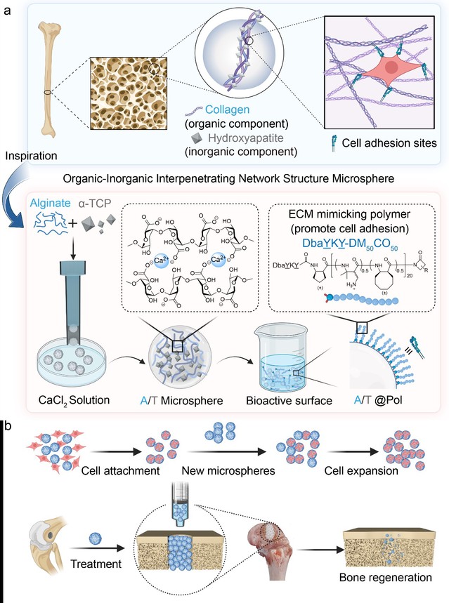 該研究選用α-磷酸三鈣(α-TCP)作為無機組分,因其水合反應(yīng)可在生理pH值條件下進(jìn)行;且其水解生成的缺鈣羥基磷灰石(CDHA)在晶體結(jié)構(gòu)、化學(xué)組成和形態(tài)特征上與天然骨礦物更為接近。同時選用具有安全無毒的海藻酸鈉(Alg)作為有機組分。值得注意的是,α-TCP釋放的Ca2+不僅能促進(jìn)缺損部位的礦化過程,還可作為海藻酸鈉凝膠化的可靠鈣源,從而確保復(fù)合材料的穩(wěn)定性。該研究通過一步離心法制備了粒徑均一可控的Alg/α-TCP復(fù)合微球,該微球具有天然骨相似的有機-無機互穿網(wǎng)絡(luò)結(jié)構(gòu)。為進(jìn)一步模擬細(xì)胞外基質(zhì)(ECM)蛋白中的細(xì)胞粘附位點,該研究采用近期發(fā)現(xiàn)具有促進(jìn)細(xì)胞粘附功能的陽離子-兩親性β-氨基酸聚合物DbaYKY-DM50CO50對微球表面進(jìn)行修飾。體外實驗表明,經(jīng)修飾的Alg/α-TCP復(fù)合微球能有效支持細(xì)胞粘附、增殖,并實現(xiàn)一體化的細(xì)胞凍存、復(fù)蘇與擴增。在大鼠股骨缺損模型中,該微球展現(xiàn)出優(yōu)異的骨修復(fù)效果。