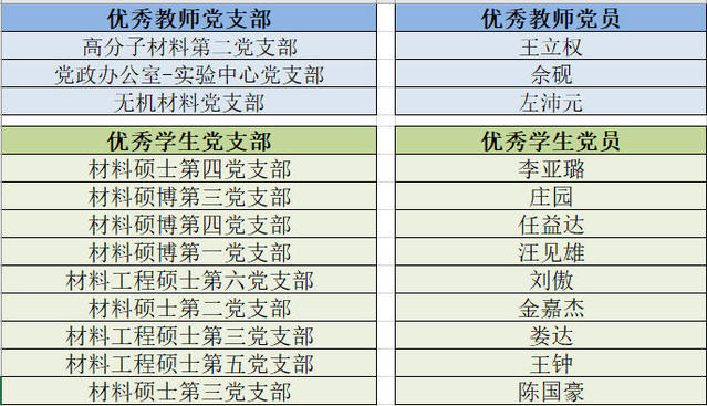 學(xué)生黨支部書(shū)記述職 經(jīng)無(wú)記名打分,高分子材料第二黨支部等3個(gè)教師黨支部、材料碩士第四黨支部等9個(gè)學(xué)生黨支部,王立權(quán)等3位教師黨員、李亞璐等9位學(xué)生黨員獲得年度優(yōu)秀。